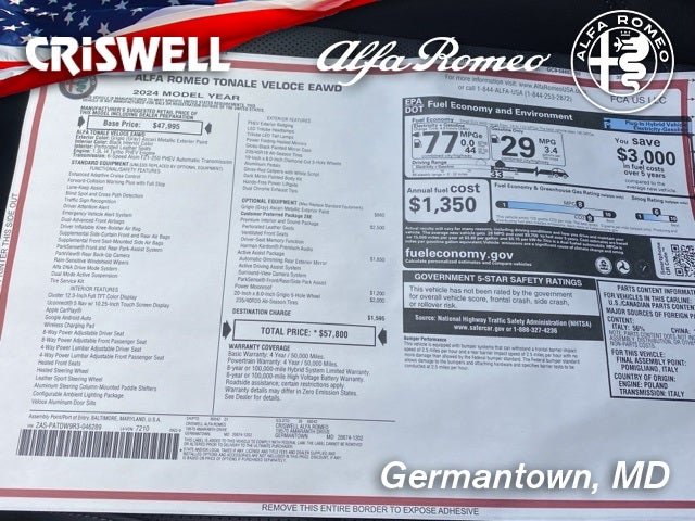 2024 Grigio (Gray) Ascari Metallic Exterior Paint Alfa Romeo TONALE VELOCE EAWD Tonale for Sale in Metro Washington, D.C., VIN = ZASPATDW9R3046289