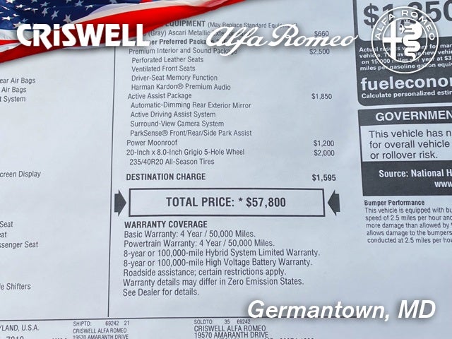 The New Vehicle Internet Sale Price (ePrice) includes rebates, offers and dealer discounts. Freight, sales tax, tags and a $800 processing charge are additional. To provide you with the best upfront pricing, ePrices are valid on in stock units only. Internet Sale Prices (ePrices) are valid based on manufacturer offer program time periods. We make every effort to provide accurate information; please verify options and price before purchasing. All prices, specifications, and availability are subject to change without notice. All financing is subject to approved credit. Pictures may be for illustrative purposes only; offers not valid on prior sales. Please contact your local Criswell Maserati and Alfa Romeo in Germantown, MD for complete details and availability.