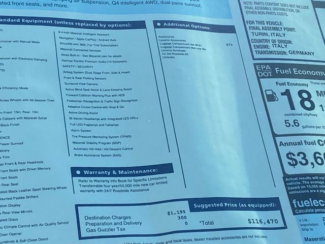 - Radio: AM/FM w/Maserati Intelligent Assistant -inc: 8.4" touchscreen display, navigation, HD radio, SiriusXM satellite radio w/1-year trial subscription, USB, aux-in, Apple CarPlay and Android Auto capable, Bluetooth® functionality, climate controls, OTA updates, Alexa in-vehicle voice assistant, eCall and bCall, remote diagnostics control and app store